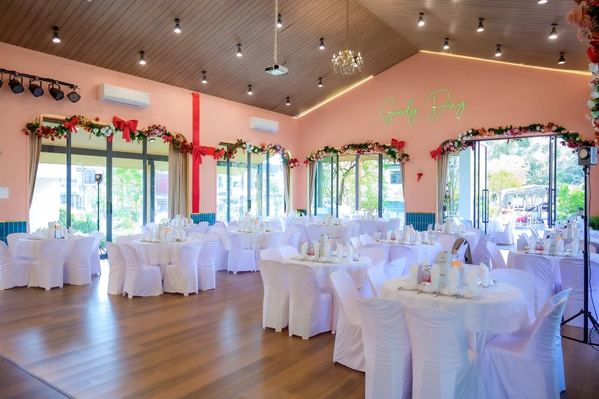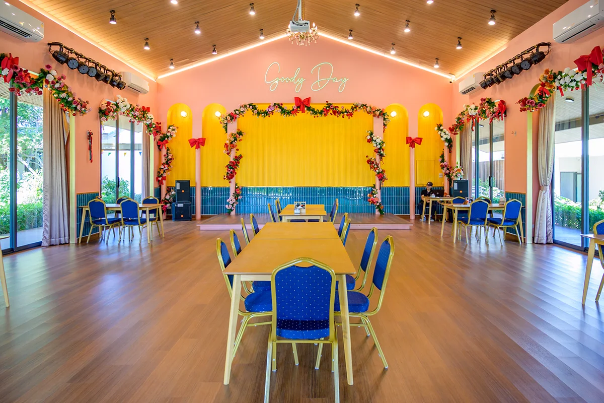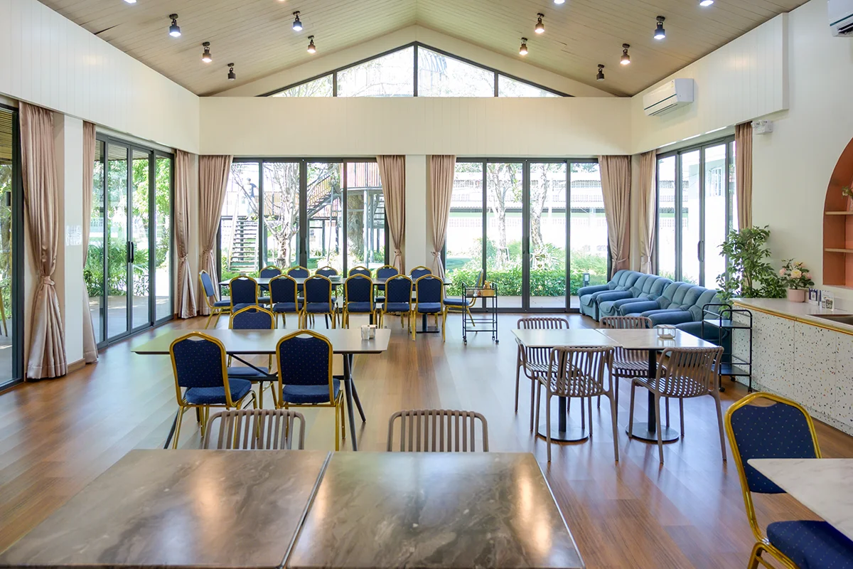 ห้องสัมมนาและจัดเลี้ยงพร้อมรองรับกิจกรรมหลากหลายรูปแบบ ไม่ว่าจะเป็นการประชุม สัมมนา เวิร์คช็อป งานเลี้ยงสังสรรค์ งานแต่งงาน หรือแม้แต่กิจกรรมอื่นๆ อีกมากมาย ด้วยพื้นที่กว้างขวาง โปร่งสบาย และบรรยากาศอบอุ่น ผสมผสานกับแสงธรรมชาติจากหน้าต่างบานใหญ่ ช่วยให้ผู้เข้าร่วมประชุมรู้สึกผ่อนคลาย มีสมาธิ และพร้อมสำหรับกิจกรรมต่างๆ